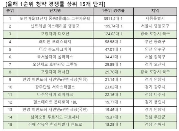 특히 비규제지역인 지방중소도시가 강세를 보였다. 올해 1순위 청약 경쟁률 상위 15개 단지 중 5개 단지가 비규제지역인 지방중소도시 물량 이었다. 먼저 포항 북구 '포항자이 디오션'은 1순위 평균 124.02대 1의 경쟁률을 기록해 3위에 올랐다. 이는 올해 서울 첫 분양 단지로 이목을 끈 '북서울자이 폴라리스'(34.43대 1)보다 높은 경쟁률이다.