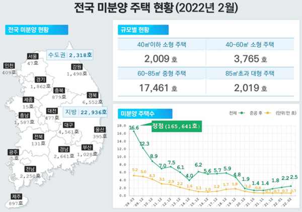 수도권은 2318호로 전월(1325호) 대비 74.9%(993호) 증가했으며 지방은 2만2936호로 전월(2만402호) 대비 12.4%(2534호) 증가했다. 준공 후 미분양은 7133호로 전월(7165호) 대비 0.4%(32호) 감소했다.