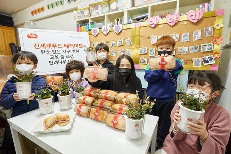 신세계푸드는 환경단체 트리플래닛과 함께 서울 광진구 군자동 한사랑지역아동센터에 ‘베러미트(Better Meat)’ 대체육 햄을 활용한 샌드위치와 반려나무를 기증했다고 4일 밝혔다.