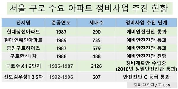 인근 '현대연예인아파트'와 '중앙구로하이츠'도 지난해 10월과 12월 잇따라 예안진을 통과했다. 1989년 입주한 현대연예인아파트는 지상 15층 6개동에 735가구(전용44~84㎡)로 구성돼 있다. '중앙구로하이츠'(1987년 준공)는 6개 동에 579가구 전용59~79㎡ 규모다. 인근 '구로한신' 단지도 지난달 재건축 추진준비위를 구성한 가운데 예안진 결과를 기다리고 있다.