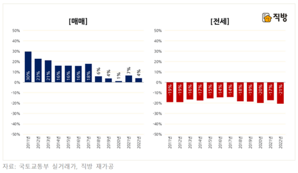 30년 이상 구축 아파트의 경우 2022년 현재 매매시장에서 일반 아파트에 비해 4%가량 높은 가격을 형성하는 반면 전세시장에서는 약 21% 낮은 가격에 거래되어 서로 상반되는 선호도를 보이고 있다.