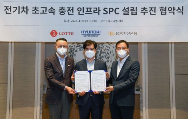 20일 현대차그룹은 서울 잠실 시그니엘 서울에서 △롯데그룹 △KB자산운용과 ‘전기차 초고속 충전 인프라 SPC(특수목적법인)’ 설립 추진을 위한 협약을 체결했다고 밝혔다. 이날 협약식에는 현대차그룹 공영운 사장, 롯데지주 이동우 대표이사, KB자산운용 이현승 대표이사 등이 참석했다.