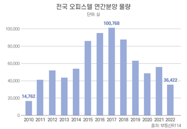 부동산R114 자료에 따르면 2022년 오피스텔 분양 및 계획 물량은 약 3만6422실로 지난 2010년 1만4762실 이후 12년 만에 가장 적은 물량이다. 지역별로는 △경기 1만2124실 △부산 5000실 △서울 4387실 △인천 3614실 순이다.
