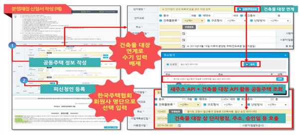 건축물대장 상의 단지정보 및 주택관련협회에 등록된 건설사 정보를 연계하여 사건 신청 시 해당 내용을 확인·선택하도록 하여 신청자의 편의성을 향상시켰다.