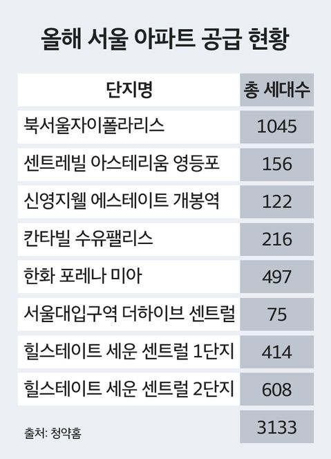 청약홈에 따르면 올 4월까지 서울에는 3133가구가 공급되는데 그쳤다. 연초 부동산 업계에서는 올해 서울에 4만가구 이상이 공급될 것으로 예측했으나 상반기 절반이 지난 현 시점에서 공급량은 계획의 10%에도 못 미치는 수준이다.