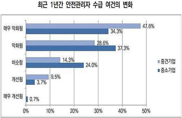 건설 안전과 관련된 대표적인 자격증인 건설안전기사와 건설안전산업기사 자격증을 보유한 인력이 한정된 데다 그마저도 대기업 군으로 지원자가 몰리면서 중소기업들이 인력난을 겪고 있다는 분석이다. 한 중견 건설사 관계자는 "수시로 채용 공고를 올리고 있지만 신규 지원은 거의 없다"면서 "최근에는 대형사로 이직하는 인원마저 발생하고 있다"고 말했다.