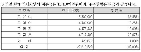이같은 국면은 지분 전쟁으로 비화되는 모양새다. 1대주주인 구본성 전 부회장과 2대주주인 구미현 이사가 지분을 합치면 압도적인 지분 비중(57.87%)을 차지하게 된다.