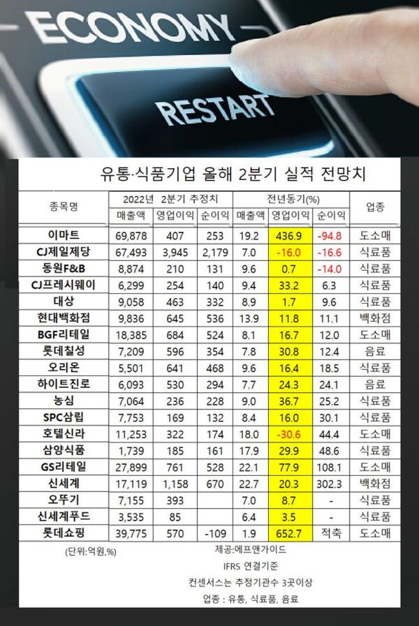 BGF리테일·오리온·SPC삼립·현대백화점 등도 실적이 소폭 오를 것으로 예상됐다. 이에 대해 유통업계 관계자는 "아직 2분기 마감까지 시간이 남은 만큼 엔데믹과 리오프닝 기조가 각 사에 어떤 영향을 줄 지 지켜봐야 한다"고 말했다.