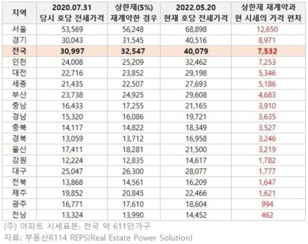 22일 부동산R114가 2020년 7월 말 임대차3법 시행(전월세상한제, 계약갱신청구권 우선 시행) 이후 전세가격 누적 변동률을 조사한 결과 전국 평균 27.69% 상승한 것으로 나타났다. 만약 임차인이 전월세상한제 5%를 활용해 재계약한 경우라면 신규 계약으로 전환되는 8월부터 시세 격차(약 22%포인트 차이)에 대한 증액분을 지금부터 미리 준비해야 한다는 의미다.