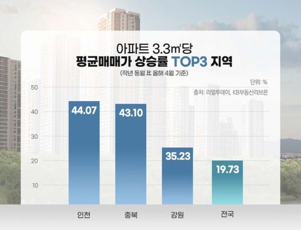 24일 부동산 전문 리서치업체 리얼투데이가 KB부동산 리브온 시계열 자료를 분석한 결과 지난 4월 기준 아파트 3.3㎡ 당 평균 매매가 상승률이 가장 높은 곳은 인천으로 1년 만에 44.07% 상승했다. 이어 충북(43.10%), 강원(35.52%)순으로 집계됐다.