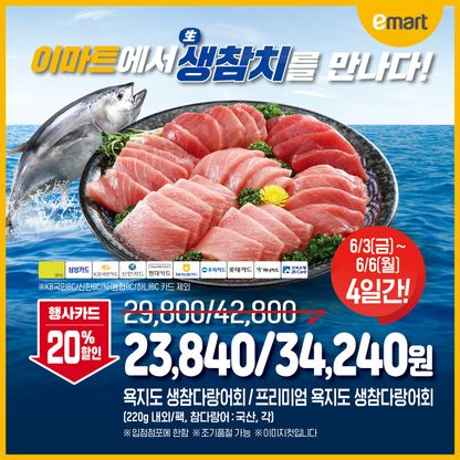 오는 3일부터 6일까지 이마트는 욕지도 생참다랑어회(220g 내외)를 행사 카드 사용 시 2만3840원에, 프리미엄 욕지도 생참다랑어회(220g 내외)를 행사 카드 사용 시 3만4240원에 판매한다. 국산 참다랑어회는 고급 횟집에서 보통 100g당 2만원 수준에 판매되고 있다.