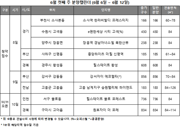 부동산 전문 리서치업체 리얼투데이에 따르면, 6월 첫째 주에는 전국 7곳에서 총 2666가구(오피스텔, 공공분양 포함, 행복주택 제외)의 청약 접수를 받는다. 이는 지난 주(6월 첫째 주) 분양물량(7797가구)보다 65.8% 줄어든 수치다. 전년 동기(7236가구)대비 63.2% 줄어든 물량이다.