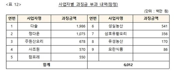 업체별 과징금은 다솔 19억8600만원, 정다운 10억7500만원, 주원산오리 6억7800만원, 사조원 5억7000만원, 참프레 5억5000만원, 성실농산 5억4100만원, 삼호유황오리 3억5600만원, 유성농산 1억7만원, 모란식품 8600만원 등이다.