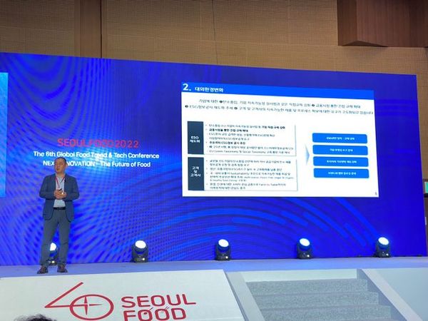 8일 일산 킨텐스에서 열린 '2022 서울국제식품산업대전' 컨퍼런스에서 고청훈 CJ제일제당 ESG센터 환경전략팀장이 CJ제일제당의 '2050 탄소중립&제로웨이스트' 전략을 발표하고 있다.