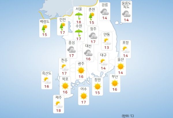 낮 최고 기온은 △서울 18도 △강릉 22도 △안동 26도 △울산 23도 △부산 23도 △여수 22도 △목포 25도 △대전 26도 △수원 24도 △인천 23도다.