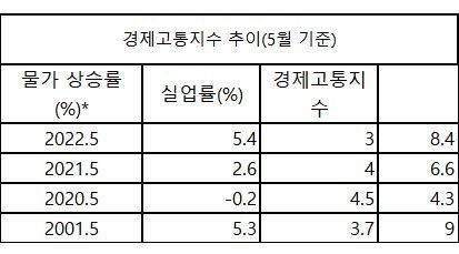 이른바 '경제고통지수'가 5월 기준으로 21년 만에 최고 수준을 기록한 것으로 나타났다. 경제고통지수란 소비자물가 상승률에 실업률을 반영한 수치로 높은 물가와 실업률로 인한 국민들의 어려운 상황을 담아냈다.