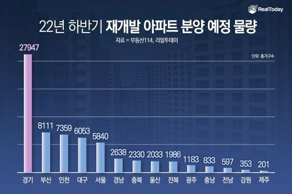 22일 부동산R114와 리얼투데이에 따르면 따르면 지역별로 공급되는 재개발 아파트 가구 수는 △경기 15곳 2만7947가구 △부산 7곳 8111가구 △인천 7곳 7359가구 △대구 5곳 6053가구 △서울 8곳 5840가구 △경남 1곳 2638가구 △충북 1곳 2330가구 △울산 1곳 2033가구 △전북 1곳 1986가구 △광주 1곳 1183가구 △충남 1곳 833가구 △전남 1곳 597가구 △강원 1곳 353가구 △제주 1곳 201가구다.