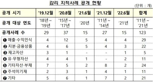 28일 금감원은 '기업의 회계처리 적용지원을 위한 2021년 회계감리 지적사례'를 발표했다. 발표에 따르면 2021년 지적사례는 총 15건이다. 그간 공개된 108건을 포함해 IFRS 시행 이후 11년간 지적사례 총 123건을 공개헀다.