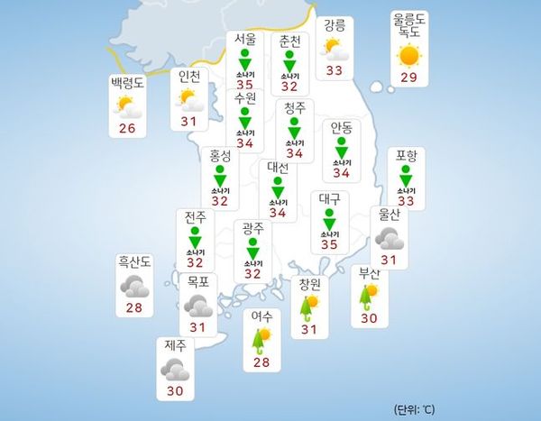지역별 낮 최고 기온은△서울 35도 △인천 31도 △춘천 33도 △강릉 33도 △대전 34도 △대구 34도 △전주 33도 △광주 33도 △부산 30도 △제주 30도다.