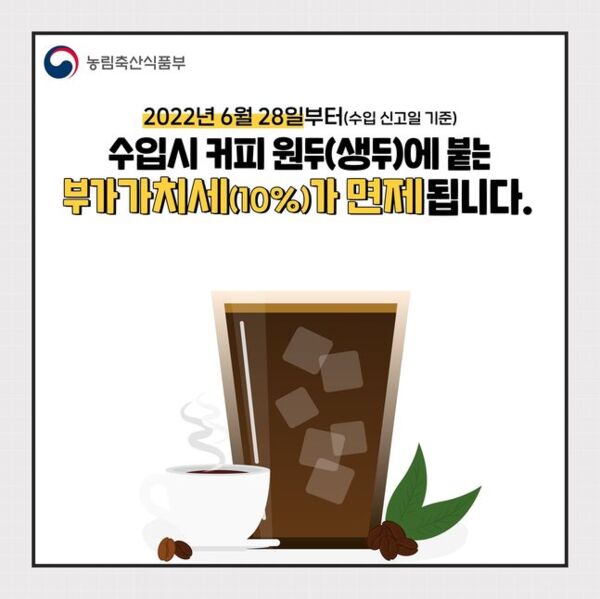 전한영 농식품부 식품산업정책관은 "이번 커피생두 부가세 면제는 환율 등으로 높아진 수입 원가 부담을 조금이나마 줄이려는 조치"라며 "하루빨리 소비자에게 혜택이 돌아갈 수 있도록 수입 유통업체와 긴밀히 협력하겠다"고 말했다.