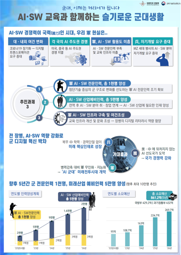 과기정통부와 국방부는 각각 오는 2026년까지 전역 후 산업계에서 활약할 디지털 인재 5만명 양성, 과학기술 강군을 선도할 군 전문인력 1000명 양성을 목표로 '군 장병 AI·SW 역량강화' 사업을 추진한다.