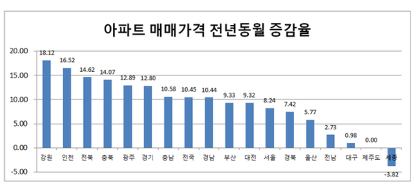실제 KB부동산 리브온 시계열 자료에 따르면 인천은 지난 1년간 전국에서 두번째로 높은 아파트값 상승률을 기록한 것으로 나타났다. 지난해 6월에서 올해 6월까지 인천의 아파트 가격은 1년 만에 무려 16.52%가 올랐다. 전국의 평균값(10.58%)을 크게 웃도는 수치다.