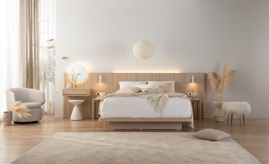 새 제품은 침실 한 쪽 벽을 아트월 디자인으로 구성해 별도의 공사 없이 호텔식 인테리어로 꾸밀 수 있는 게 특징이다. 침대 헤드보드에 은은한 조명과 템바보드(MDF를 반원이나 직각 형태로 가공해 이어붙인 것)를 포인트로 적용해 밋밋한 벽을 아트월로 연출하고, 모서리 부분에는 곡선형 패널을 추가해 마치 인테리어 공사를 한 것처럼 벽면을 자연스럽게 마감 할 수 있다.