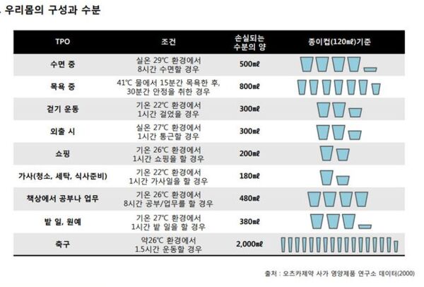 무엇보다도 폭염으로 인한 온열질환을 예방하기 위해서는 탈수 방지가 중요한데 포카리스웨트는 물보다 체내 보존 비율이 20% 가량 더 높은 것으로 알려졌다. 폭염 예방을 위해선 충분한 수분이 중요하다. 수분 보충이 충분히 이뤄지지 않으면 기력 저하 등 이상 징후를 야기한다. 수분이 5% 부족하면 중추신경계 이상을 초래해 온열질환을 발생할 수 있다. 8%를 넘어가면 현기증과 함께 근육경련이 일어나고 11%를 잃으면 일사병에서 심하게는 혼수상태나 사망에까지 이르게 된다.