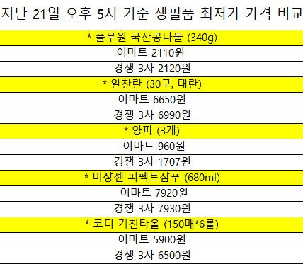최저가 끝판왕 자리를 겨냥한 이마트가 경쟁 3사(홈플러스·롯데마트·쿠팡) 중 일부 필수식품·소비재에서는 가격이 가장 싼 것으로 나타났다.