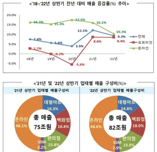 산업통상자원부가 28일 발표한 '상반기 및 6월 주요 유통업체 매출 동향'에 따르면 상반기 주요 유통업체의 매출은 지난해 동기보다 9.3% 늘었다. 오프라인 유통업체의 매출이 8.4% 늘었고 온라인 유통업체는 10.3% 증가했다.