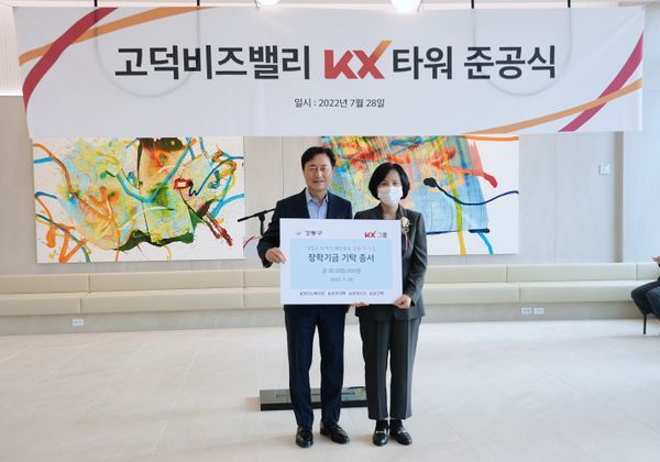 최상주 KX그룹 회장은 지난 28일 강동구 고덕비즈밸리 KX그룹 신사옥 준공식을 통해 이수희 강동구청장에게 장학금과 장학증서를 전달했다.