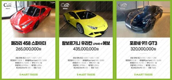 최근 2억6500만원짜리 중고 페라리가 팔린 이마트 트레이더스 동탄점에서 3~4억원대에 달하는 람보르기니와 포르쉐도 판매 중인 것으로 나타났다.