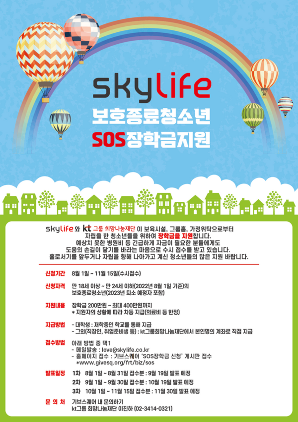 스카이라이프는 사회적 지원의 사각지대에 있는 청소년들의 자립을 지원하기 위해 KT그룹 희망나눔재단과 보호종료청소년 SOS장학금 지원사업을 준비했다. 지난해에는 총 43명에게 장학금 약 9000만원을 지원한 바 있다.
