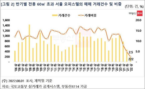 가장 큰 폭으로 축소된 지역은 서울이다. 올해 상반기 서울의 전용 60㎡초과 거래는 222건(8993건 중 2.5%)으로 실거래가 집계가 시작된 2006년 이래 반기 기준으로 거래건수와 비중이 모두 최소 수준으로 조사됐다. 올해부터 오피스텔 매수 시에도 DSR(총부채원리금상환비율) 규제가 적용돼 대출한도가 낮아졌고 이자 상환 부담이 커지면서 상대적으로 가격 수준이 높은 전용 60㎡초과 면적대의 거래가 감소한 것으로 풀이된다.