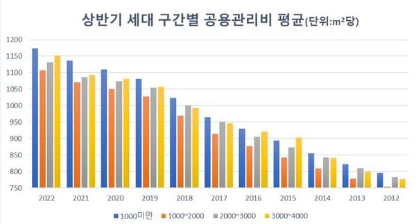 관리비가 저렴한 아파트는 1000~2000가구 규모 단지로 파악됐다. 올해 상반기 아파트 공용관리비를 세대 구간별로 분석을 해 본 결과 1000~2000가구인 단지의 3m²당 공용관리비는 1107원이었다. 2000~3000가구 단지는 1132원으로 뒤를 이었다. 이어 4000~5000가구 1139원, 3000~4000가구 1152원 순이었다. 1000세대 이하는 3m²당 공용관리비가 1,174원으로 가장 높았다.