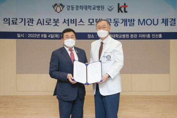 KT는 강동경희대학교병원과 '의료기관 AI 로봇 서비스 모델 공동개발을 위한 업무협약'을 체결했다고 4일 밝혔다.