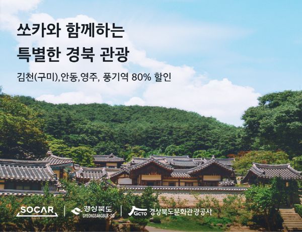 이번 할인 프로모션은 경상북도·경북문화관광공사와 함께 진행한다. 경북지역을 찾는 관광객은 쏘카 차량을 80% 할인된 가격으로 사용할 수 있다. 쏘카가 40%, 경상북도가 40%를 부담한다.