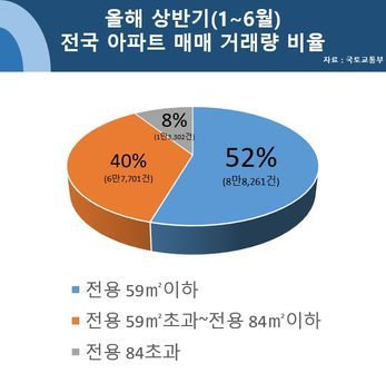 전용면적 59㎡이하의 소형 아파트 거래량은 8만8261건으로 전체의 52%를 차지했다. 같은 기간 전용면적 59㎡초과~84㎡이하 아파트는 만7701건, 전용면적 84㎡초과 아파트는 1만3302건을 기록했다.