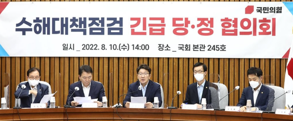 국민의힘은 10일 긴급 당정 협의에서 "수해 피해가 큰 지역에 대해 특별재난지역 선포가 신속히 이뤄질 수 있도록 정부에 요청하겠다"고 밝혔다.