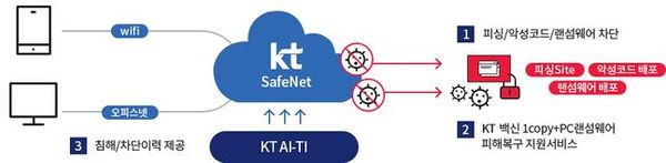 KT 세이프넷은 보안 장비를 구축하거나 인력 없이도 인터넷 보안을 강화할 수 있는 부가서비스다. KT 인터넷 회선을 사용 중인 사업자가 서비스 청약만 하면 월 4400원(3년 약정 기준)으로 인터넷 보안 서비스를 이용할 수 있다.