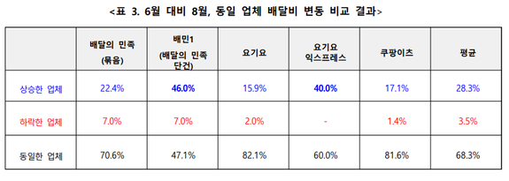배달비 인상폭은 단건배달 서비스에서 더 크게 나타났다. 배달의민족 '배민1'은 평균 46% 인상했으며, 단건배달만 운영하는 쿠팡이츠는 건당 4000원까지 올렸다. 요기요 익스프레스도 40% 가량 배달비가 뛰어 올랐다.