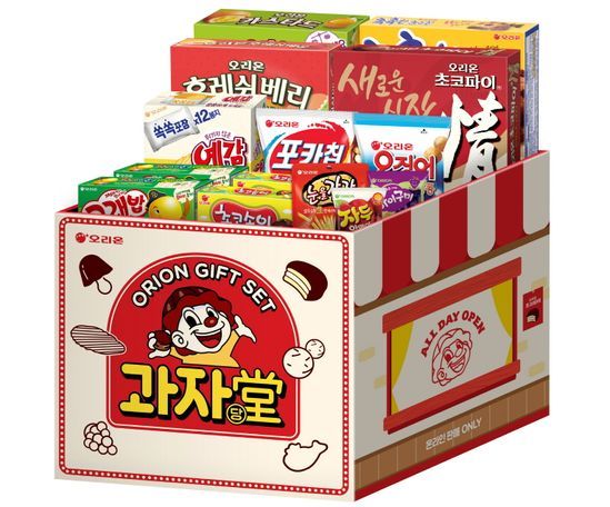 5일 식음료업계에 따르면 오리온은 추석 한정 '과자당(堂)' 선물세트를 출시했다. 선물세트에는 밀레니얼 세대들의 향수를 자극하는 초코파이情, 고래밥, 오징어땅콩 등 수년간 스테디셀러였던 과자 12종이 담겼다. 선물세트 패키지는 과자 전문점을 연상시키는 레트로풍 디자인이 적용됐다.