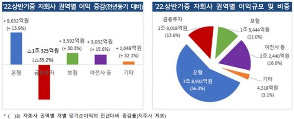 자회사 권역별로는 은행이 9652억원(+13.9%), 보험은 3592억원(+30.3%), 여전사 등은 3032억원(+15.6%) 증가한 반면 금융투자는 수수료 수익 감소 등으로 1조325억원(-35.2%) 줄어들었다.