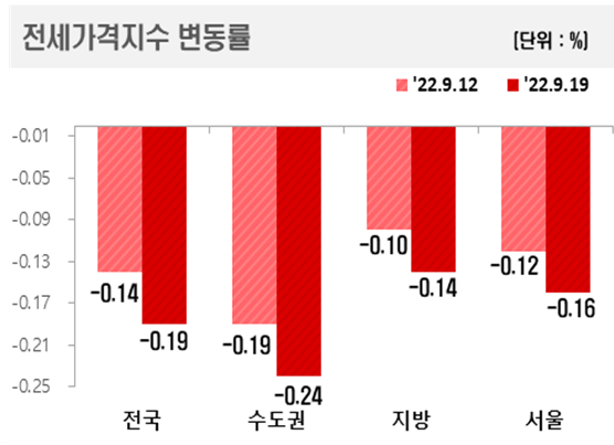 한국부동산원은 9월 셋째주(19일 기준) 전국 주간 아파트가격 동향을 조사한 결과 서울 아파트 전세 가격은 지난주보다 0.04%포인트 떨어진 0.16% 하락을 보였다고 22일 밝혔다. 전국과 수도권 기준으로는 각각 –0.19%, -0.24%로 하락폭이 0.05%포인트 커졌다.