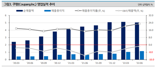 이어 "쿠팡은 광고수익, 풀필먼트 수수료 수익 등으로 수익구조를 본격적으로 다변화해 나가고 있다"며 "최근 실적 추이 등을 감안하면 2023년 이후부터는 흑자를 시현할 수 있다"고 덧붙였다.