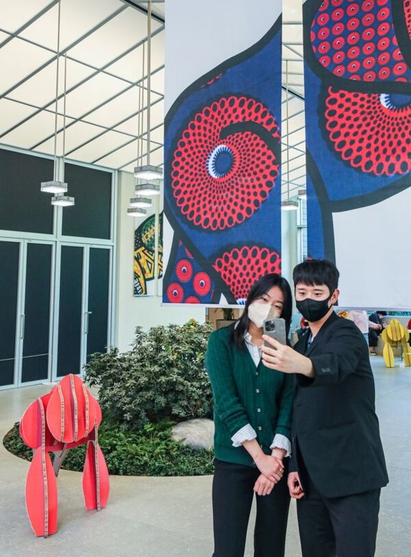 이번 전시는 아티스트이자 스위스 프리미엄 코스메틱 브랜드인 '발몽 그룹'을 이끌고 있는 '디디에 기욤'에 의해 탄생한 고릴라 '이보'가 자유를 만끽할 수 있는 자연으로 돌아갈 수 있기를 바라는 마음을 담아 기획됐다. 다채로운 색상의 실크 스크린 작품을 비롯해 재활용 골판지를 활용한 조각 작품 등이 전시된다. 사진은 이날 오전 서울 양천구 현대백화점 목동점 7층 글라스하우스에서 고객들이 '탄자니아의 이보' 전시를 관람하며 기념사진을 촬영하고 있는 모습.