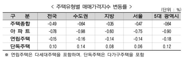 전국 월간 주택종합 매매가격은 -0.49%로 전월대비(-0.29%) 하락폭 확대됐다. 수도권 기준으로는 -0.40%에서 -0.64%로 떨어졌다. 아파트 가격은 전국 기준 -0.78%, 수도권 기준 -0.98% 하락했다.