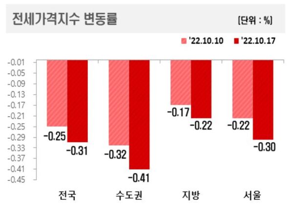 한국부동산원은 "계속되는 금리인상 영향으로 신규 전세수요는 감소 중이고 재계약시에도 반전세‧월세로 전환하는 추세로 매물 적체 가중되는 가운데, 계약 만기가 도래한 급매물 위주의 하락거래가 매물가격 하락세를 주도하며 지난주 대비 하락폭이 확대됐다"고 말했다.