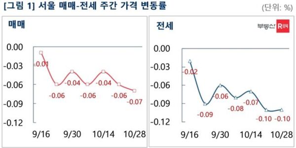28일 부동산R114에 따르면 금주 서울 아파트값 변동률은 -0.07%를 기록했다. 재건축이 0.08%, 일반 아파트가 0.07% 떨어졌고 신도시는 0.02%, 경기·인천은 0.05% 하락했다.