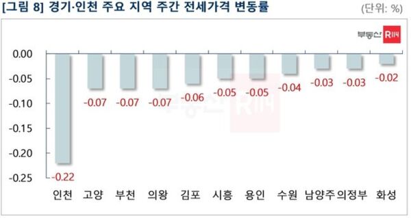 경기·인천은 ▼인천(-0.22%) ▼고양(-0.07%) ▼부천(-0.07%) ▼의왕(-0.07%) ▼김포(-0.06%) ▼시흥(-0.05%) ▼용인(-0.05%) 등이 떨어졌다. 신도시는 ▼평촌(-0.25%) ▼위례(-0.08%) ▼분당(-0.06%) ▼중동(-0.06%) ▼동탄(-0.06%) ▼파주운정(-0.04%) 등이 떨어졌다.